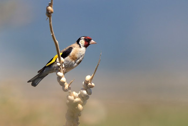 Superbe chardonneret (carduelis carduelis), perché sur des branchages avec des petits escargots blancs ! Nous avons à peu près le même paysage, dans le sud de la France (Nîmes et Montpellier). Très belle photo!
